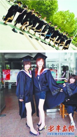 在2006年毕业[BiYe]季时,中国人民大学的一组女生露腿毕业[BiYe]照在网上流传,由此引来了网友们的一片批评之声,许多网友在初次看到这样的照片[ZhaoPian]之后痛批这些女生“太风尘”“太浮躁”,还有人认为这种行为简直就是在侮辱学士服。“学士服是文化的表现,穿着学士服露大腿还拍照我认为不妥。如果照着自己纪念还可以,但还发到网上就更为不妥了。”一位网友在2006年时评论道。 近几年网上不断出现此类照片[ZhaoPian],有的照片[ZhaoPian]更为恶搞。这其中,有一批网友认为这种行为并没有不妥,而只是一种个性的张扬和解放,没有必要对他们进行这样的抨击。记者从往年的网友评论中也看出,存在对立观点的网友不在少数,因此很容易就引发一场网络论战。相比起数年前网友们对此问题争议不断,而记者发现,从今年网友们的评论来看,网友们似乎已经对露大腿这种个性毕业[BiYe]照失去了新鲜感,表现得相当淡定。“这些照片[ZhaoPian]好像在哪见过,不是今年刚照的吧?”“没新意,年年都拍这种露腿照片[ZhaoPian],能不能换个创意啊?”对于这些照片[ZhaoPian],有网友已经见怪不怪,表现得很淡定,还有网友拐弯调侃女学生们的照片[ZhaoPian]太落伍,“我第一次见这种照片[ZhaoPian]的时候,猪肉当时才四元一斤。” 岛城高校女生称“很正常”
