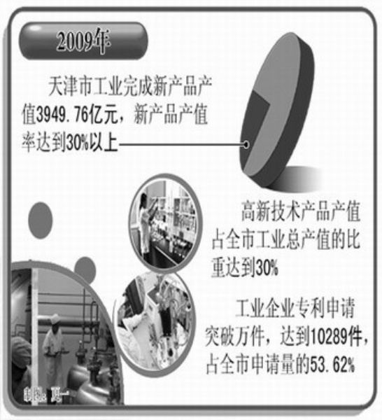 天津市积极推进以企业技术创新为核心的创新体系建设,实现产业共性技术和产品核心技术的突破。2009年,天津市工业完成新产品产值3949.76亿元,新产品产值率达到30%以上,高新技术产品产值占全市工业总产值的比重达到30%。工业企业专利申请突破万件,达到10289件,占全市申请量的53.62%。