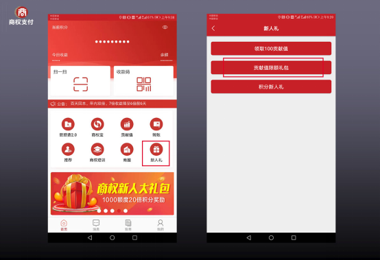举例说明:用户购买500元贡献值限额礼包,一共将获得4000贡献值转商权通,分为三个阶段转换成商权通,其中本金等额商权通可随时提现,其余7倍贡献值转商权通可用于红返商圈购物。