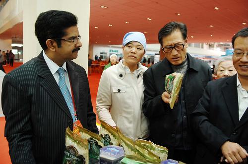 9月21日,一位国外客商在给参观者介绍展品。新华社记者 王鹏 摄
