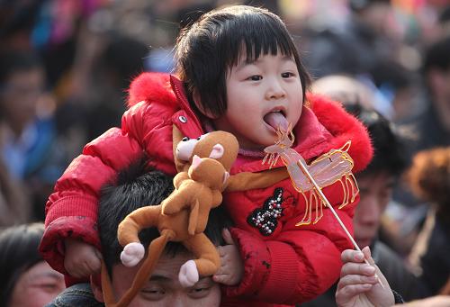 1月26日,一名小朋友在南京夫子庙景区品尝糖画。新华社发(李文宝 摄)