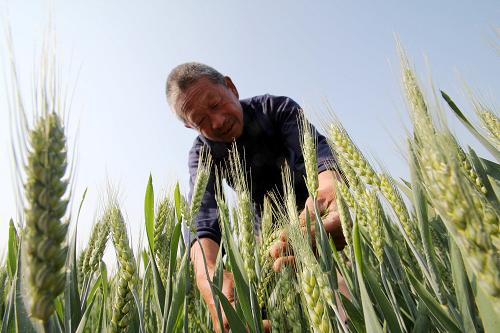 5月10日,山东省临沂市郯城县郯城街道办事处十里村农民在查看小麦长势。农业部日前发布的消息显示,据对全国夏粮主产区的12个重点市县分析会商,今年夏粮丰产的苗架已经搭起,只要后期天气正常,小麦增产希望很大。目前距小麦大面积收获还有不到1个月。针对目前局部地区病虫害偏重,部分田块存在倒伏隐患以及可能遭遇渍涝、干热风的情况,专家建议立足抗灾夺丰收,强化技术指导,狠抓措施落实,特别是要落实好“一喷三防”政策。新华社发(张春雷 摄)
