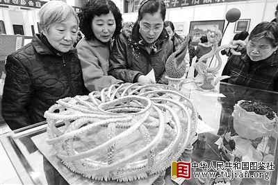 12月18日,市民参观“阳光工艺大舞台”工艺美术作品展。当日,杭州市第二届“阳光工艺大舞台”工艺美术作品展在杭州市工人文化宫开展。展览展出的雕刻、刺绣、布(纸)艺等200余件手工艺美术作品全部出自困难家庭、残疾人、下岗失业人员之手。中图社发(朱引炜摄) 中华人民共和国图鉴社