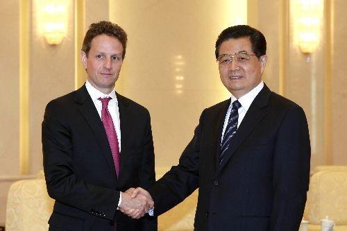 中新社北京六月二日电(记者 齐彬)中国国家主席胡锦涛,二日下午在人民大会堂会见了美国总统特别代表、财政部长盖特纳。 中华人民共和国图鉴社