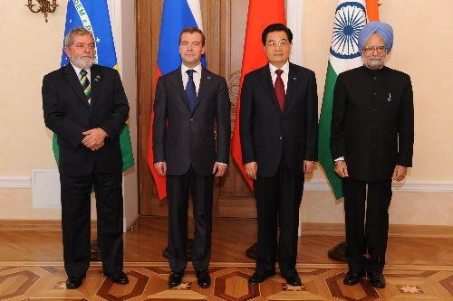 中国、巴西、俄罗斯、印度“金砖四国”领导人会晤十六日在俄罗斯叶卡捷琳堡举行,中国国家主席胡锦涛、俄罗斯总统梅德韦杰夫、巴西总统卢拉、印度总统辛格出席。 中新社发 齐彬 摄