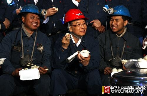 临近中午12时,从早上7时就下到矿井里工作的工人们要吃中饭了。在巷道里,温家宝坐在枕木上与工人们一起用餐。他一边吃饭,一边询问工人们的生产生活情况。他对大家说,中国是世界上最大的产煤国,应该有世界上最先进的矿井、最先进的技术和设备、最优秀的产业工人。在应对国际金融危机时,一定要把煤炭生产搞好。必须正确处理保增长与安全生产的关系,任何时候安全生产都是第一位的,在安全生产中实现经济平稳较快增长。同时,要下决定引进新技术,大力推进清洁生产,让煤炭生产质量和效益走在世界的前列。温家宝在矿井下呆了两个小时,才与矿工们惜别。 中华人民共和国图鉴社