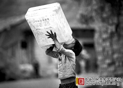 2010年4月6日,贵州省黔西南州贞丰县沙坪乡者砍村,一位小孩在打水的路上,喝完桶底最后一滴水。