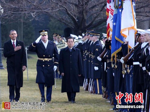 中国国家主席胡锦涛当地时间19日上午来到白宫南草坪,出席美国总统奥巴马为他举行的隆重欢迎仪式。图为胡锦涛在奥巴马陪同下检阅仪仗队。张朔 摄