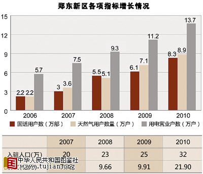 官方数据显示:建设8年的郑东新区,2010年固定资产投资首次突破200亿元,累计固定资产投资完成近1000亿元,年度财政总收入首次突破100亿元,固定资产投资、地方财政收入、地方一般预算收入和出口总值四项指标增幅居郑州市第一;固定资产投资和财政收入绝对值、增幅创历史最好成绩。税收从2005年的2.17亿元增加到2010年的21.90亿元,增长10倍。