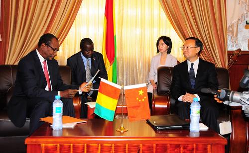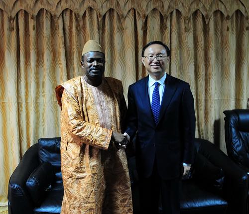 2月14日,在几内亚科纳克里,几内亚总理福法纳(左)会见到访的中国外交部长杨洁篪。几内亚总统孔戴和总理福法纳14日分别在首都科纳克里会见了到访的中国外交部长杨洁篪。新华社记者 吴昌荣 摄