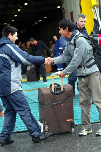 2月26日,在希腊克里特岛,希腊服务人员[RenYuan]和从利比亚[LiBiYa]撤离[CheLi]至此的中方人员[RenYuan]握手。2898名中方人员[RenYuan]乘坐中国[ZhongGuo]驻希腊大使馆租用的“韦尼泽洛斯”号客轮于当地时间26日上午抵达克里特岛。 新华社发(马里奥斯·罗洛斯 摄)