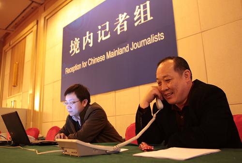 2月26日,新闻中心的工作人员在值班。 新华社记者[JiZhe] 邢广利 摄