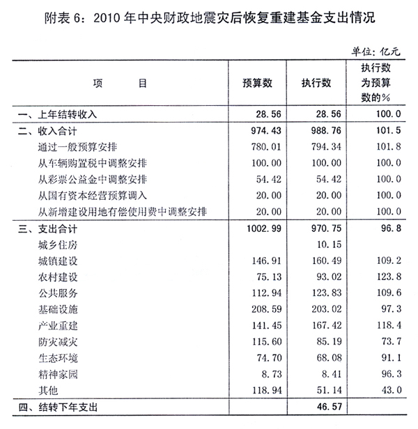 (14)地震灾后恢复重建支出[ZhiChu]794.34亿元,完成预算[YuSuan]的101.8%。其中,中央[ZhongYang]本级支出[ZhiChu]37.9亿元,对地方转移支付756.44亿元。汶川地震灾后恢复重建三年任务两年基本完成。2008-2010年,汶川地震灾后恢复重建支出[ZhiChu]累计2330.88亿元,加上中央[ZhongYang]国有资本经营预算[YuSuan]等安排的支出[ZhiChu]655.82亿元和结转下年支出[ZhiChu]46.57亿元,合计3033.27亿元,实现三年中央[ZhongYang]财政[CaiZheng]对地震灾后恢复重建投入3000亿元的规划目标。