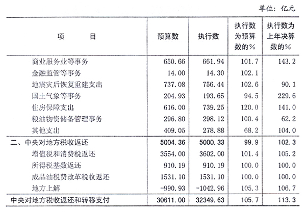 (13)商业服务业等事务支出[ZhiChu]802.85亿元,完成预算[YuSuan]的94.2%,增长29.9%,与预算[YuSuan]的差异主要是据实结算的石油、棉花等物资储备费用减少。其中,中央[ZhongYang]本级支出[ZhiChu]140.91亿元,对地方转移支付661.94亿元。继续实施家电汽车下乡以及家电、汽车以旧换新政策,补贴403.58亿元。国家储备棉、糖、肉等补贴支出[ZhiChu]31.93亿元。推进新农村现代流通服务网络工程建设,促进商贸流通服务业发展,支出[ZhiChu]81亿元。