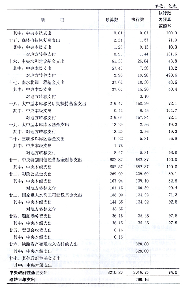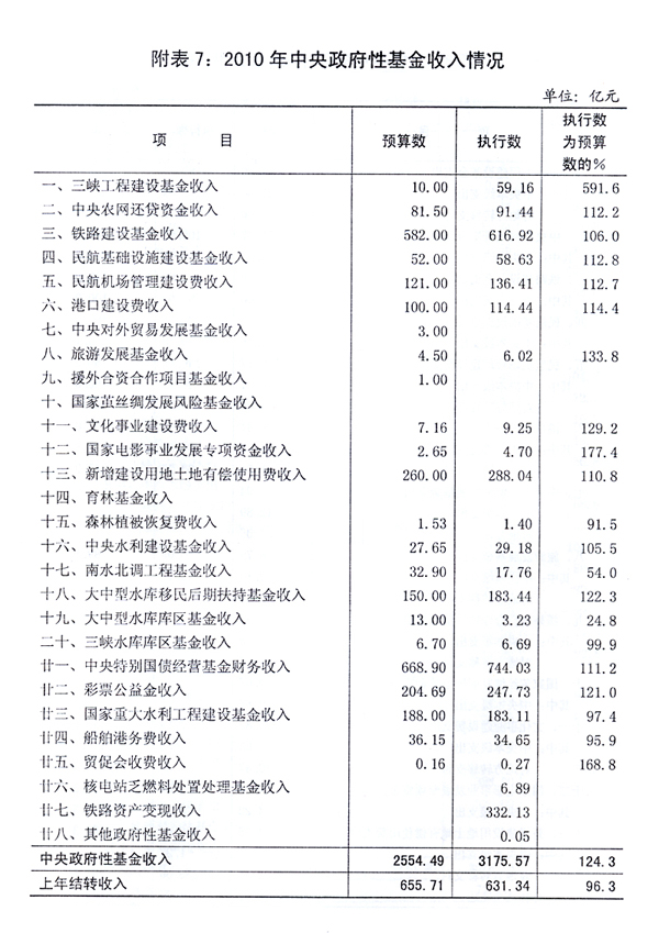 中央[ZhongYang]政府性基金收入[ShouRu]3175.57亿元,完成预算[YuSuan]的124.3%。其中:三峡工程建设基金收入[ShouRu]59.16亿元,铁路建设基金收入[ShouRu]616.92亿元,港口建设费收入[ShouRu]114.44亿元,民航机场管理建设费收入[ShouRu]136.41亿元,彩票公益金收入[ShouRu]247.73亿元,大中型水库移民后期扶持基金收入[ShouRu]183.44亿元,中央[ZhongYang]农网还贷资金收入[ShouRu]91.44亿元等。加上2009年结转收入[ShouRu]631.34亿元,2010年使用的中央[ZhongYang]政府性基金收入[ShouRu]总量3806.91亿元。中央[ZhongYang]政府性基金支出[ZhiChu]3016.75亿元,完成预算[YuSuan]的94%。其中:中央[ZhongYang]本级支出[ZhiChu]2284.05亿元,包括三峡工程建设支出[ZhiChu]69.89亿元,铁路建设支出[ZhiChu]582亿元,港口建设支出[ZhiChu]87.15亿元,民航机场管理建设支出[ZhiChu]46.76亿元,彩票公益金用于社会福利、体育、教育等社会公益事业支出[ZhiChu]139.1亿元,大中型水库移民后期扶持基金支出[ZhiChu]0.45亿元,中央[ZhongYang]农网还贷资金支出[ZhiChu]102.87亿元等;对地方转移支付732.7亿元,增加133.4亿元,增长22.3%。中央[ZhongYang]政府性基金结转下年支出[ZhiChu]790.16亿元。
