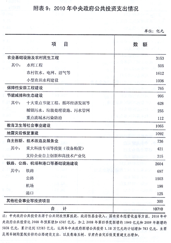 按照中央[ZhongYang]的决策部署,并经全国人大审议批准,2010年中央[ZhongYang]财政[CaiZheng]加大了对农业、教育、医疗卫生、社会保障和就业、保障性安居工程、科学技术、环境保护等方面的投入,各项重点支出[ZhiChu](包括中央[ZhongYang]本级支出[ZhiChu]和中央[ZhongYang]对地方转移支付支出[ZhiChu])得到较好保障。