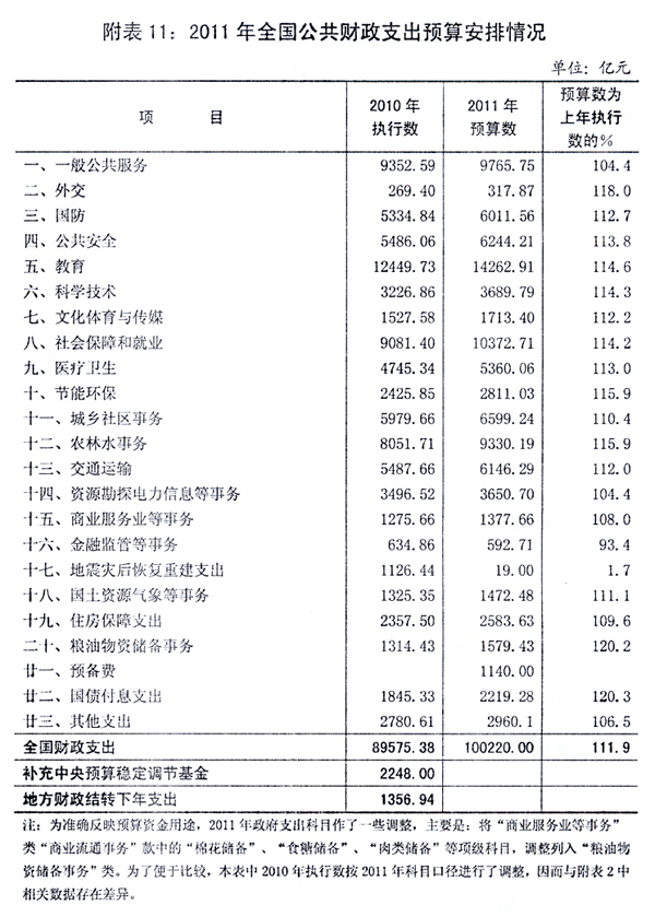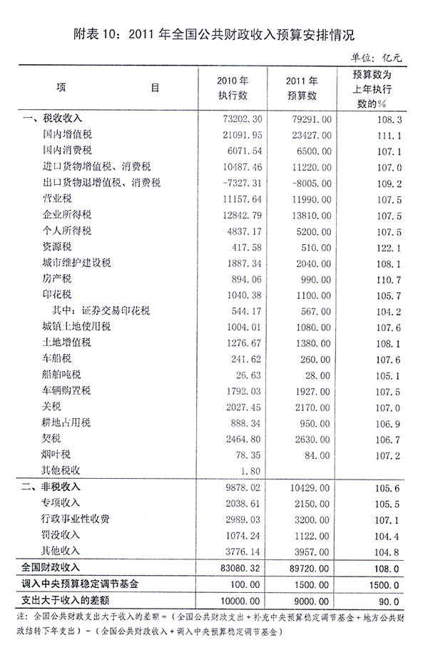 汇总中央[ZhongYang]预算[YuSuan]和地方预算[YuSuan]安排,全国财政[CaiZheng]收入[ShouRu]89720亿元,增长8%,加上从中央[ZhongYang]预算[YuSuan]稳定调节基金调入1500亿元,可安排的收入[ShouRu]总量为91220亿元;全国财政[CaiZheng]支出[ZhiChu]100220亿元,增长11.9%。全国财政[CaiZheng]收支差额9000亿元,占GDP的比重由2010年的2.5%下降到2%左右。这样安排,既考虑了巩固和发展应对国际金融危机冲击成果、保持经济平稳较快发展的需要,也体现了促进财政[CaiZheng]可持续发展的要求。
