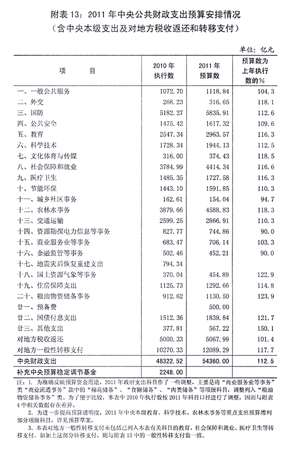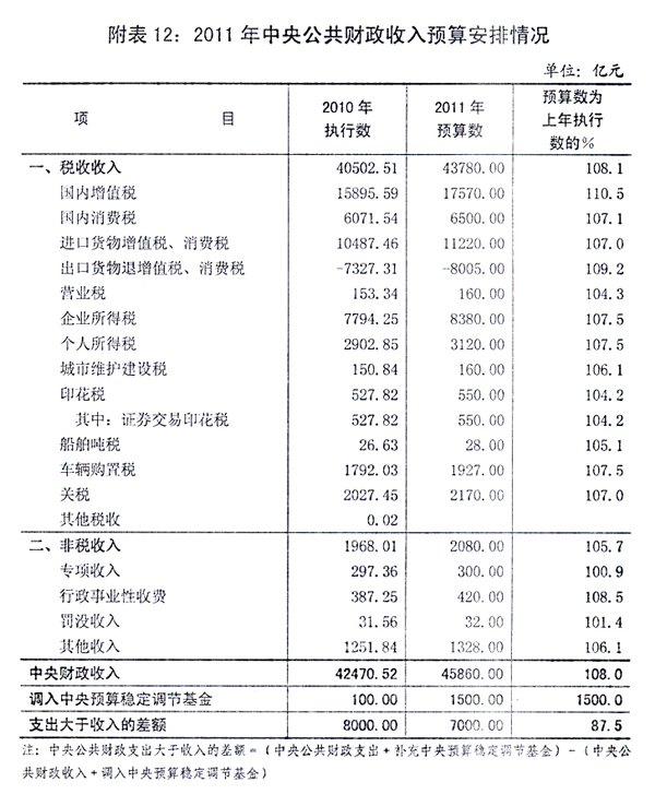 根据中央[ZhongYang]经济工作会议确定的2011年经济发展预期指标、经济社会政策和财政[CaiZheng]预算[YuSuan]编制的总体要求,2011年公共财政[CaiZheng]预算[YuSuan]主要指标拟安排如下:中央[ZhongYang]财政[CaiZheng]收入[ShouRu]45860亿元,比2010年执行数(下同)增长8%。从中央[ZhongYang]预算[YuSuan]稳定调节基金调入1500亿元。合计收入[ShouRu]总量为47360亿元。中央[ZhongYang]财政[CaiZheng]支出[ZhiChu]总量54360亿元,增长12.5%。其中,中央[ZhongYang]本级支出[ZhiChu]17050亿元,增长6.7%;中央[ZhongYang]对地方税收返还和转移支付支出[ZhiChu]37310亿元,增长15.3%。中央[ZhongYang]财政[CaiZheng]收支总量相抵,赤字7000亿元,比2010年预算[YuSuan]数减少1500亿元。中央[ZhongYang]财政[CaiZheng]国债余额限额77708.35亿元。