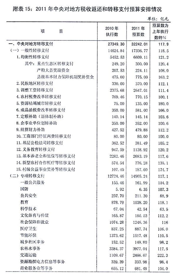 进一步优化转移支付结构,2011年中央[ZhongYang]对地方税收返还和转移支付支出[ZhiChu]37310亿元,增长15.3%。其中:税收返还5067.99亿元,增长1.4%;一般性转移支付17336.77亿元,增长18.5%;专项转移支付14905.24亿元,增长17.1%。在一般性转移支付中,均衡性转移支付安排6609.11亿元,增长21.2%。其中:安排县级基本财力保障机制奖补资金775亿元,增强基层政府提供基本公共服务的能力;安排资金300亿元,提高三江源等生态功能区的财政[CaiZheng]保障能力。民族地区转移支付安排370亿元,支持西藏、新疆等少数民族地区实现跨越式发展。继续实施资源枯竭城市转移支付制度,安排资金135亿元。成品油税费改革转移支付安排581亿元。
