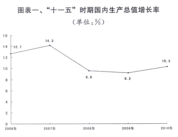 新华社北京3月17日电 关于2010年国民经济和社会发展[FaZhan]计划执行情况 与2011年国民经济和社会发展[FaZhan]计划草案的报告 ——2011年3月5日在第十一届全国人民代表大会第四次会议上 国家发展[FaZhan]和改革[GaiGe]委员会 各位代表: 受国务院委托,现将2010年国民经济和社会发展[FaZhan]计划执行情况与2011年国民经济和社会发展[FaZhan]计划草案提请十一届全国人大四次会议审议,并请全国政协各位委员提出意见。 一、2010年国民经济和社会发展[FaZhan]计划执行情况 去年,我国经济社会发展[FaZhan]环境极为复杂,各类自然灾害和重大挑战极为严峻。在中国共产党的坚强领导下,全国各族人民深入贯彻落实科学发展[FaZhan]观,按照十一届全国人大三次会议审议批准的国民经济和社会发展[FaZhan]计划,坚持实施[ShiShi]应对国际金融危机冲击的一揽子计划,加快推进[TuiJin]经济发展[FaZhan]方式转变,巩固了经济社会发展[FaZhan]良好势头。计划执行情况总体是好的,“十一五”规划确定的主要目标[MuBiao]和任务胜利完成。 (一)经济保持平稳较快增长[ZengChang] 经济运行总体平稳,质量效益明显改善。全年国内生产总值39.8万亿元,增长[ZengChang]10.3%,超过预期目标[MuBiao]2.3个百分点。一、二、三产业分别增长[ZengChang]4.3%、12.2%和9.5%,超过预期目标[MuBiao]0.3个、4个和0.8个百分点。工业增加值16万亿元,增长[ZengChang]12.1%,超过预期目标[MuBiao]4.1个百分点。煤电油气运等的运行调节和综合协调得到加强,保障了经济社会发展[FaZhan]、居民生活以及受灾地区、重大活动、重要时段的需求。全年国家财政收入8.3万亿元,增长[ZengChang]21.3%,财政赤字比预算减少500亿元。广义货币供应量M2增长[ZengChang]19.7%,新增人民币贷款7.95万亿元。企业效益继续提高,1-11月,全国规模以上工业企业实现利润3.88万亿元,同比增长[ZengChang]49.4%。 图表一:“十一五”时期国内生产总值增长[ZengChang]率 新华社发 内需持续扩大,增长[ZengChang]的拉动力趋向协调。扩大消费的各项政策取得积极成效,消费需求潜力进一步[JinYiBu]释放。社会消费品零售总额156998亿元,比上年增长[ZengChang]18.3%,超过预期目标[MuBiao]3.3个百分点。全国家电下乡产品销售7718万台,增长[ZengChang]1.3倍。汽车销售1806万辆,增长[ZengChang]32.4%。投资保持适度增长[ZengChang],结构进一步[JinYiBu]改善。全社会固定资产投资278140亿元,比上年增长[ZengChang]23.8%,超过预期目标[MuBiao]3.8个百分点。两年新增4万亿元投资计划圆满完成。鼓励和引导民间投资健康发展[FaZhan]的若干意见发布实施[ShiShi],为民间投资注入了新的活力,2010年民间投资占城镇固定资产投资比重达51.1%,比上年提高3个百分点。消费、投资、净出口为经济增长[ZengChang]分别贡献了3.9个、5.6个和0.8个百分点。