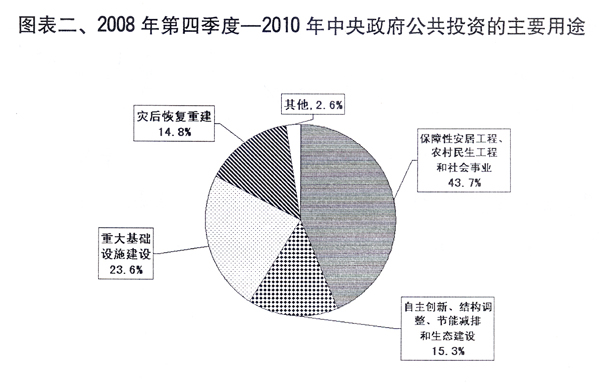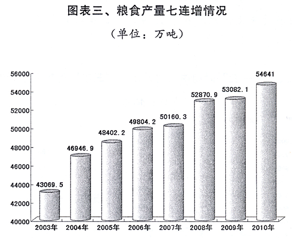 图表二:2008年第四季度—2010年中央政府公共投资的主要用途 新华社发 价格总水平基本稳定,市场秩序进一步[JinYiBu]规范。实行稳定价格与改善民生多措并举,做好粮、棉、肉、糖等重要商品的收储和投放工作;增加鲜活农产品绿色通道政策品种,并将实施[ShiShi]范围扩大到所有收费公路;完善困难群众生活补助与物价变动的联动机制,减轻价格上涨对居民生活的影响;停止和取消一批收费项目,降低一批收费标准和药品价格,减轻企业和群众负担;组织开展涉企收费、电力价格、农产品价格等专项整治和打击侵犯知识产权、制售假冒伪劣产品专项行动,营造有序的价格和市场环境。全年居民消费价格总水平上涨3.3%,基本实现调控目标[MuBiao]。 (二)农业基础得到加强 粮食等主要农产品稳定增产。克服部分地区特大干旱、低温寡照、严重洪涝等灾害影响,全年粮食产量54641万吨,比上年增加1559万吨,增长[ZengChang]2.9%,实现了连续7年增产。油料产量3239万吨,增长[ZengChang]2.7%。畜牧业生产总体平稳,全年肉类总产量7925万吨,增长[ZengChang]3.6%;水产品产量5366万吨,增长[ZengChang]4.9%。受部分地区气候条件不利、种植面积减少等因素影响,棉花产量597万吨,下降6.3%;糖料产量12045万吨,下降1.9%。