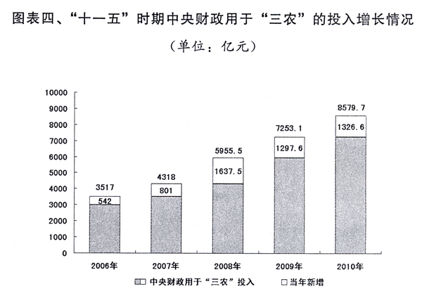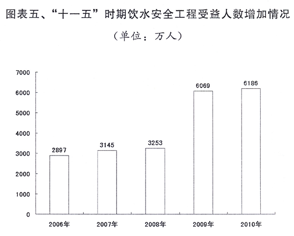 图表三:粮食产量七连增情况 新华社发 强农惠农政策有效实施[ShiShi]。全年中央财政用于“三农”方面的支出8579.7亿元,比上年增长[ZengChang]18.3%,其中,用于农业和农村建设[JianShe]的中央预算内投资1928亿元,占全部中央预算内投资的比重达到49%。耕地保护工作进一步[JinYiBu]加强,全国整治土地130多万公顷,新增耕地30多万公顷。全国新增千亿斤粮食生产能力规划全面实施[ShiShi],棉油糖基地、植保工程、动物防疫体系、种养业良种工程得到加强。制定并实施[ShiShi]了加强中小水利设施建设[JianShe]、促进农业机械化、保障蔬菜生产供应等方面政策。规划内病险水库除险加固任务全面完成,第二轮小型病险水库除险加固启动实施[ShiShi]。支持建设[JianShe]了一批农产品批发市场、粮油仓储、农产品冷链物流等流通基础设施。小麦、稻谷最低收购价每50公斤比2009年平均提高3元和6元,大豆、油菜籽临时收储政策得到较好落实,化肥供应较为充足。对种粮农民实行“四项补贴”的规模达到1226亿元。 图表四:“十一五”时期中央财政用于“三农”的投入增长[ZengChang]情况 新华社发 农村生产生活条件继续改善。2010年,解决了6186万农村居民和农村学校师生的饮水安全问题,农村安全饮水普及率达到71.3%。新增农村电网线路30万公里。乡镇、建制村的油路通畅率分别达到96%和81%。支持建设[JianShe]大中型沼气工程1343处,全国新增沼气用户500万户。农村危房改造120万户,完成计划目标[MuBiao]。新建万村千乡农家店10万家,农村连锁经营网络初步形成。 图表五:“十一五”时期引水安全工程受益人数增加情况 新华社发 (三)经济结构调整积极推进[TuiJin] 自主创新能力增强。16个国家科技重大专项与973、863、支撑计划顺利实施[ShiShi],上海光源、国家纳米科学中心等重大科学工程建成并通过验收,中科院知识创新三期工程基本完成,数字电视、下一代互联网等50个国家工程中心、32个国家工程实验室、在企业设立的56个国家重点实验室以及高世代液晶显示面板、大规模集成电路、支线飞机等重大项目建设[JianShe]顺利推进[TuiJin]。大型飞机研制取得新进展。认定国家级企业技术中心93家,国家创新型试点企业达到550家,创新型试点城市45个。自主研发的高效能计算机“天河一号”运算速度跃居世界第一。 高技术产业发展[FaZhan]加快。全年高技术制造业增加值增长[ZengChang]16.6%,提高8.9个百分点。集成电路、电子元件、微型计算机设备、移动通信手持机等主要高技术产品产量分别增长[ZengChang]57.4%、30.1%、35%和46.4%;软件销售收入1.3万亿元,增长[ZengChang]30%。技术市场交易额突破3000亿元。加快培育和发展[FaZhan]战略性新兴产业决定颁布实施[ShiShi],现代中药等7个高技术产业化专项积极推进[TuiJin],新建了18个国家高技术产业基地,设立了13只创业投资基金。 工业结构调整取得新进展。重点行业调整振兴规划进一步[JinYiBu]实施[ShiShi],安排200亿元重点产业振兴和技术改造专项资金,支持了5051个技术改造项目。首钢搬迁顺利完成,鞍钢与攀钢重组取得实质性进展。加快医药行业结构调整的指导意见颁布实施[ShiShi]。淘汰落后产能任务全面完成。火电、炼钢、炼铁、水泥、平板玻璃、造纸等行业分别淘汰落后产能1210万千瓦、931万吨、4000万吨、11619万吨、1105万重箱和472万吨,超过计划目标[MuBiao]210万千瓦、331万吨、1500万吨、6619万吨、505万重箱和419万吨。 服务业稳定发展[FaZhan]。启动了服务业综合改革[GaiGe]试点,运用服务业发展[FaZhan]引导资金,支持重点领域和薄弱环节加快发展[FaZhan],颁布实施[ShiShi]了促进节能服务产业发展[FaZhan]的意见。2010年,服务业就业人数占就业总人数比重达到34.8%,服务业增加值占国内生产总值的比重为43%。