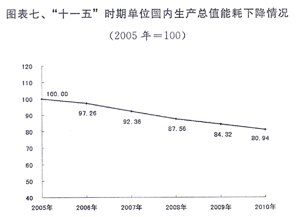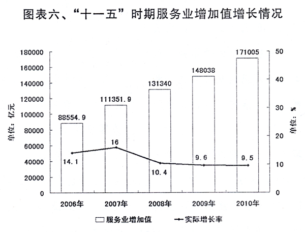 图表六:“十一五”时期服务业增加值增长[ZengChang]情况 新华社发 基础设施和基础产业保障能力提升。全国铁路营业里程9.1万公里,增加4986公里;公路通车总里程398万公里,增加12万公里;内河高等级航道里程1万公里,增加500公里,沿海港口深水泊位1774个,新增125个;民用运输机场通航175个,新增9个。光缆线路长度995万公里,增加166万公里;互联网宽带接入端口1.88亿个,增加4924万个。能源重点项目、能源基地和储运设施建设[JianShe]得到加强。13个大型煤炭基地已有11个产能达到亿吨,一批清洁能源项目竣工投产,石油储备二期项目加快建设[JianShe],西电东送工程北、中、南通道的总输送能力超过7800万千瓦。全年原煤产量32.4亿吨,增长[ZengChang]8.9%;原油产量2.03亿吨,增长[ZengChang]7.1%;天然气产量967.6亿立方米,增长[ZengChang]13.5%;发电量42065亿千瓦小时,增长[ZengChang]13.2%。 区域发展[FaZhan]的协调性增强。区域发展[FaZhan]总体战略向纵深推进[TuiJin],全国主体功能区规划发布实施[ShiShi]。深入实施[ShiShi]西部大开发战略的若干意见顺利出台,推进[TuiJin]西藏、新疆跨越式发展[FaZhan]和长治久安的意见,以及加快四川、云南、甘肃、青海四省藏区发展[FaZhan]的意见颁布实施[ShiShi],重庆两江新区批准设立。新开工建设[JianShe]西部大开发重点工程23项,投资总规模6822亿元。对东北地区工业结构优化升级和现代服务业发展[FaZhan]的支持力度加大,扶持东北建设[JianShe]现代农业的指导意见制定出台,资源型城市可持续发展[FaZhan]的政策体系进一步[JinYiBu]完善。促进中部地区崛起规划全面落实,“三基地、一枢纽”建设[JianShe]步伐加快,促进中部地区城市群发展[FaZhan]的指导意见以及皖江城市带承接产业转移示范区规划出台,武汉城市圈、长株潭城市群、中原城市群、鄱阳湖生态经济区、太原城市圈的辐射带动作用进一步[JinYiBu]增强。中西部地区承接产业转移工作取得新进展。东部地区产业结构升级和自主创新积极推进[TuiJin],深圳等经济特区、上海浦东新区、天津滨海新区改革[GaiGe]开放步伐加快,促进长江三角洲地区发展[FaZhan]的规划颁布实施[ShiShi],全国海洋经济发展[FaZhan]试点开始启动。对革命老区、民族地区、边疆地区和贫困地区的扶持力度进一步[JinYiBu]加大。2010年,安排中央以工代赈投资55亿元和易地扶贫搬迁试点资金20亿元,易地扶贫搬迁人口87万人,超过计划目标[MuBiao]11万人,又有909万农村贫困人口脱贫,基本完成计划目标[MuBiao]。 (四)节能环保和应对气候变化成效明显 节能减排目标[MuBiao]基本实现。2010年,用于节能减排方面的中央预算内投资333亿元,中央财政专项资金518亿元,分别比上年增长[ZengChang]1.4倍和73%。积极推进[TuiJin]十大重点节能工程,形成节能能力3310万吨标准煤。大力实施[ShiShi]节能产品惠民工程,推广高效节能空调近3000万台、节能汽车100多万辆、高效照明产品1.6亿只。新能源汽车示范推广试点启动实施[ShiShi]。国家“城市矿产”示范基地建设[JianShe]积极推进[TuiJin]。支持城镇污水垃圾处理设施建设[JianShe],全年新增城镇污水日处理能力1900万立方米、城市生活垃圾日处理能力6.8万吨;城市污水处理率、城市生活垃圾无害化处理率分别达到76.9%和72.5%,比上年提高1.6个和1.2个百分点。2010年,单位国内生产总值能耗下降4.01%,二氧化硫、化学需氧量排放量分别下降1.32%和3.08%;万元工业增加值用水量下降9.6%,工业固体废物综合利用率提高2个百分点。过去五年,单位国内生产总值能耗累计下降19.06%,二氧化硫和化学需氧量排放量分别下降14.29%和12.45%,万元工业增加值用水量下降36.7%,基本或超额完成“十一五”规划目标[MuBiao]。