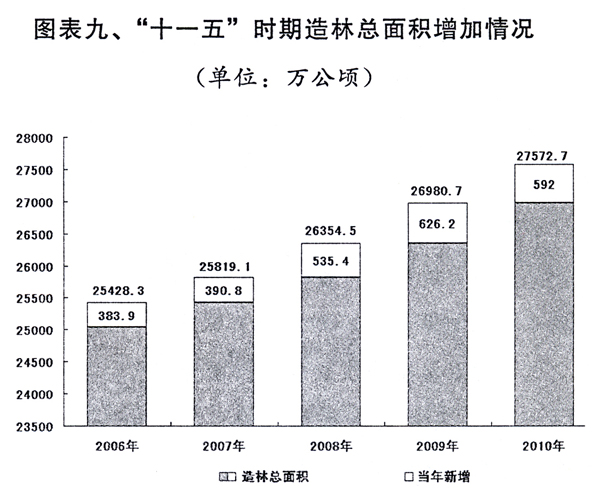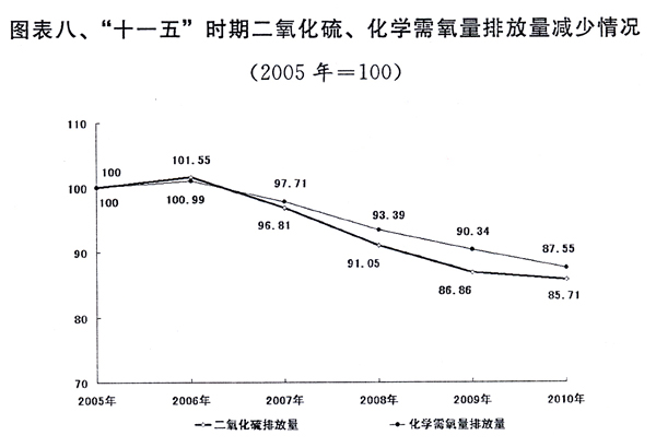 图表七:“十一五”时期单位国内生产总值能耗下降情况 新华社发 图表八:“十一五”时期二氧化硫、化学需氧量排放量减少情况 新华社发 生态环境保护迈出新步伐。退耕还林、退牧还草成果进一步[JinYiBu]巩固,天然林资源保护一期工程全面完成,长江上游、黄河上中游全面停止了天然林的商品性采伐,生物多样性得到保护和恢复。2010年,全国新增造林面积592万公顷,实施[ShiShi]退牧还草666.7万公顷,综合治理水土流失面积4.2万平方公里。全国水资源综合规划颁布实施[ShiShi],“三河三湖”、黄河中上游、三峡库区及上游、渤海、松花江、丹江口库区及上游等重点流域污染治理积极推进[TuiJin],太湖流域水环境综合治理总体方案全面实施[ShiShi]。