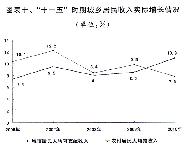图表九:“十一五”时期造林总面积增加情况 新华社发 应对气候变化工作进一步[JinYiBu]加强。国家方案得到有效实施[ShiShi],低碳技术创新积极推进[TuiJin],低碳省区和低碳城市试点工作进展顺利。成功举办联合国气候变化谈判天津会议,积极开展和参与全方位的国际交流与合作。 (五)改革[GaiGe]开放进一步[JinYiBu]深化 重点领域和关键环节改革[GaiGe]取得新突破。农村改革[GaiGe]方面,集体林权制度改革[GaiGe]有序开展,80%以上的集体林确权到户,国有林场林区改革[GaiGe]试点、农垦管理体制改革[GaiGe]稳步推进[TuiJin]。企业改革[GaiGe]方面,中央企业及其下属企业改制面超过70%,规范董事会试点扩大到32家。电力、邮政、市政公用事业等改革[GaiGe]取得新进展。多项促进非公有制经济和中小企业发展[FaZhan]的配套政策颁布实施[ShiShi]。财税体制改革[GaiGe]方面,27个省份970个县实行了省直管县财政管理方式改革[GaiGe],油气等资源税改革[GaiGe]在西部地区试点,统一了内外资企业和个人城市维护建设[JianShe]税、教育费附加制度。金融体制改革[GaiGe]方面,国家开发银行、政策性金融机构、资产管理公司改革[GaiGe]稳步推进[TuiJin],中国农业银行成功上市,股指期货顺利推出,企业债券稳步发展[FaZhan],人民币汇率形成机制改革[GaiGe]继续推进[TuiJin],跨境贸易人民币结算范围扩大。资源性产品价格改革[GaiGe]方面,城市供水成本公开试点、农业水价综合改革[GaiGe]试点进展顺利,对超能耗限额产品实行了惩罚性电价,制定统一的农林生物质发电上网电价。社会事业改革[GaiGe]方面,医药卫生体制五项重点改革[GaiGe]深入推进[TuiJin],国家基本药物制度在60%的政府办基层医疗卫生机构实行,公立医院改革[GaiGe]在16个国家试点城市及37个省级试点地区积极探索并不断深化,出台了进一步[JinYiBu]鼓励和引导社会资本举办医疗机构意见。国家教育体制改革[GaiGe]试点全面启动,义务教育学校绩效工资改革[GaiGe]深入实施[ShiShi]。文化体制改革[GaiGe]有序推进[TuiJin],国有文艺院团转企改制省级试点和经营性出版单位转企改制基本完成。全国综合配套改革[GaiGe]试点取得积极成效。 开放型经济发展[FaZhan]水平进一步[JinYiBu]提高。坚持实施[ShiShi]市场多元化战略和以质取胜战略,加强对“两高一资”产品出口调控,增加国内紧缺的原材料、高载能产品、先进技术及关键零部件进口,贸易不平衡状况得到改善。全年外贸进出口总额29727.6亿美元,增长[ZengChang]34.7%,其中,出口增长[ZengChang]31.3%,进口增长[ZengChang]38.7%;顺差比上年减少6.4%。出台进一步[JinYiBu]做好利用外资工作的意见,引导外资投向高端制造业、高技术产业、现代服务业、新能源、节能环保产业和中西部地区。全年利用外商直接投资(不含银行、证券、保险领域)1057.4亿美元,增长[ZengChang]17.4%。借用国外贷款205亿美元,增长[ZengChang]57%。积极实施[ShiShi]“走出去”战略,一批重点境外投资项目取得新进展。全年非金融类对外直接投资590亿美元,增长[ZengChang]36.3%。对外承包工程完成营业额922亿美元,增长[ZengChang]18.7%。 (六)保障和改善民生工作全面加强 城乡居民收入继续增加。城镇居民人均可支配收入和农村居民人均纯收入分别达到19109元和5919元,增加1934元和766元,剔除价格因素,比上年实际增长[ZengChang]7.8%和10.9%,超过预期目标[MuBiao]1.8个和4.9个百分点。这是1998年以来首次农村居民收入增速快于城镇居民。 图表十:“十一五”时期城乡居民收入实际增长[ZengChang]情况 新华社发 就业稳定增长[ZengChang]。积极就业政策实施[ShiShi]力度加大,基层公共就业和社会保障服务设施建设[JianShe]得到加强,在中西部地区建设[JianShe]了162个县级服务中心和610个乡级服务中心。全年城镇新增就业1168万人,超过预期目标[MuBiao]268万人;城镇登记失业率4.1%,实现预期目标[MuBiao]。 社会保障水平进一步[JinYiBu]提高。到2010年底,城镇参加基本养老保险人数25673万人,超过计划目标[MuBiao]1673万人;新型农村社会养老保险试点范围扩大到24%的县。城镇企业职工基本养老保险、流动就业人员基本医疗保障关系转移接续办法顺利实施[ShiShi]。城镇参加基本医疗保险人数43206万人,比上年增加3059万人;新型农村合作医疗参合人数8.35亿人,参合率96.3%,比上年扩大2.1个百分点。提高了城乡最低生活保障、失业保险、企业退休人员基本养老金、优抚对象抚恤和生活补助、家庭经济困难学生资助等保障和救助标准。灾后恢复重建工作进展顺利,汶川地震灾后恢复重建实现三年任务两年基本完成目标[MuBiao],玉树、舟曲灾后恢复重建全面展开。