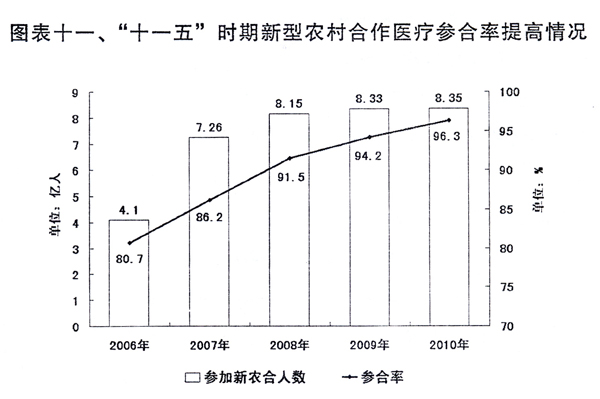 图表十一:“十一五”时期新型农村合作医疗参合率提高情况 新华社发 保障性安居工程建设[JianShe]大规模推进[TuiJin]。进一步[JinYiBu]提高了中西部地区新建廉租住房和农村危房改造中央补助标准,加快发展[FaZhan]公共租赁住房,并将其纳入保障性安居工程建设[JianShe]规划。2010年,全国保障性住房和棚户区改造住房开工590万套,超过计划目标[MuBiao]10万套,其中,保障性住房322万套,棚户区改造268万户;全年基本建成370万套。 社会建设[JianShe]得到加强。国家中长期教育改革[GaiGe]和发展[FaZhan]规划纲要、人才发展[FaZhan]规划纲要颁布实施[ShiShi]。改造农村中小学校舍1325万平方米,建设[JianShe]中等职业学校校舍212万平方米。全国“两基”人口覆盖率达到100%,初中阶段三年保留率94%;高中阶段毛入学率达到82.5%,提高3.3个百分点;高等教育毛入学率26.5%,普通本专科招生661.8万人,研究生招生53.8万人。医疗卫生服务体系建设[JianShe]进展顺利。支持建设[JianShe]和改造了891所县级医院、1620所中心乡镇卫生院、1228所社区卫生服务中心和116所精神卫生防治机构。人口自然增长[ZengChang]率5‰左右,完成计划目标[MuBiao],年末总人口13.41亿人。广播电视村村通工程、乡镇综合文化站建设[JianShe]、西新工程和文化资源信息共享工程稳步推进[TuiJin]。国家博物馆、国家话剧院等重大文化工程进展顺利,全国免费开放的公共博物馆、纪念馆和爱国主义教育基地达到1743家。重点旅游景区基础设施建设[JianShe]得到加强,海南国际旅游岛建设[JianShe]积极推进[TuiJin]。哲学社会科学、新闻出版、文学艺术等事业繁荣发展[FaZhan]。上海世博会圆满成功,有246个国家和国际组织参展,是世博会历史上参展单位最多的一届。广州亚运会、亚残运会成功举办。群众体育工作迈上新台阶,全国已建成农民体育健身工程超过23万个。社会福利事业发展[FaZhan]加快,社会服务机构床位数达到312.3万张,增长[ZengChang]4.3%。 在国际经济环境复杂多变、国内自然灾害多发重发的情况下,国民经济保持平稳较快发展[FaZhan],回升向好态势进一步[JinYiBu]巩固,取得的成绩来之不易。这是党中央国务院统揽全局、坚强领导的结果,是各地区各部门认真执行中央方针政策、密切配合、扎实工作的结果,是全国各族人民迎难而上、共同努力的结果。经过五年的努力,“十一五”规划《纲要》确定的22个经济社会发展[FaZhan]主要指标中,8个约束性指标全部实现,14个预期性指标除服务业就业比重、服务业增加值占国内生产总值比重和研发支出占国内生产总值比例3个指标没有完成外,其余都已顺利实现。 在看到成绩的同时,我们也清醒地认识到,国内发展[FaZhan]依然面临着一些突出矛盾和问题。一是粮食稳定增产和农民持续增收基础不牢固。耕地、淡水等资源约束加剧,水利基础设施依然薄弱,农业科技水平总体不高,比较效益长期偏低,农民外出务工仍面临制度性障碍。二是经济结构调整任务艰巨。提高自主创新能力面临激励机制不完善、核心技术和高端人才缺乏等制约,一些领域盲目投资、产能过剩问题进一步[JinYiBu]暴露,淘汰落后产能工作难度加大,服务业发展[FaZhan]仍然滞后,城乡区域发展[FaZhan]不平衡、不协调问题依然突出。三是物价上涨压力较大。输入性通胀压力上升,市场流动性宽松,游资投机炒作现象增多,资源、土地、劳动力等要素成本上升已成为推动价格上涨的长期性因素。去年物价上涨构成中,70%左右是由食品价格上涨引起的,加大了城乡居民特别是中低收入家庭生活压力。部分大中城市房价涨幅过高,普通居民通过市场解决住房问题的难度依然较大。四是资源环境约束强化。能源资源消耗总量偏大、增长[ZengChang]偏快,主要污染物排放量大。节能减排长效机制尚未建立,“两高”行业增长[ZengChang]依然偏快,节能减排和应对气候变化压力加大,可持续发展[FaZhan]面临较大挑战。五是社会矛盾增多。收入分配、社会保障、上学、就医等方面与人民群众要求还有较大差距,食品药品安全、征地拆迁、安全生产等方面损害群众利益的行为时有发生。同时,世界经济复苏进程艰难曲折,部分国家债务沉重,失业率居高难下,全球流动性继续增加,国际市场大宗商品价格和主要货币汇率持续动荡,这些不稳定不确定因素也增加了做好国内工作的难度。对于上述问题,我们将高度重视,采取有效措施,认真加以解决。 二、2011年经济社会发展[FaZhan]的总体要求和主要目标[MuBiao] 今年的经济社会发展[FaZhan]工作,要全面贯彻党的十七大和十七届三中、四中、五中全会精神,以邓小平理论和“三个代表”重要思想为指导,深入贯彻落实科学发展[FaZhan]观,正确把握国内外形势新变化新特点,以科学发展[FaZhan]为主题,以加快转变经济发展[FaZhan]方式为主线,实施[ShiShi]积极的财政政策和稳健的货币政策,增强宏观调控的针对性、灵活性、有效性,加快推进[TuiJin]经济结构调整,大力加强自主创新,切实抓好节能减排,不断深化改革[GaiGe]开放,着力保障和改善民生,巩固和扩大应对国际金融危机冲击成果,保持经济平稳较快发展[FaZhan],促进社会和谐稳定。 按照上述总体要求,考虑到需要和可能,并与“十二五”规划《纲要》相衔接,提出2011年经济社会发展[FaZhan]主要目标[MuBiao]: ——保持经济稳定增长[ZengChang]。国内生产总值增长[ZengChang]8%左右。主要考虑