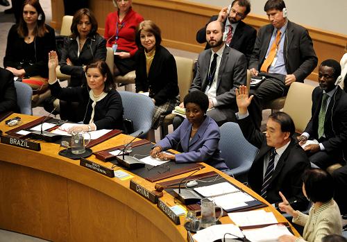 3月17日,在美国纽约联合国总部,中国常驻联合国代表李保东(前右二)、巴西常驻联合国代表维奥蒂(前左一)举手投弃权票。当日,联合国安理会[AnLiHui]通过决议[JueYi],决定在利比亚[LiBiYa]设立禁飞区。新华社记者 申宏 摄