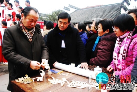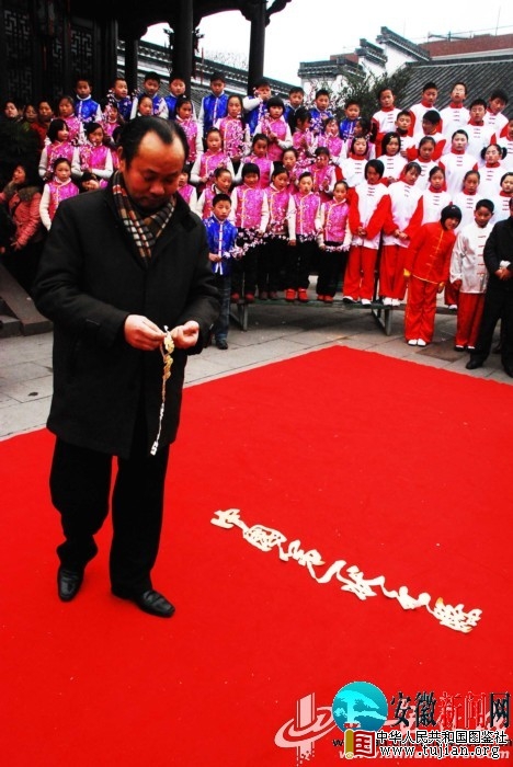 安徽新闻网2月1日电 近日,“撕纸成书”的创始人蒋劲华在休宁县状元博物馆内仅用半个小时的时间撕出了“中国第一状元县”七个神采飞扬的金色大字,引来当地众多市民驻足赞赏,为文化大县休宁增添了浓浓的节日气氛。