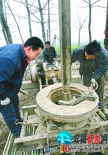 2月15日,打井队在宿州市埇桥区夹沟镇新风村打水井抗旱。该井由当地政府资助,不但为抗旱提供新水源,而且能解决5000名村民饮水问题。记者姚林摄 tujian.org