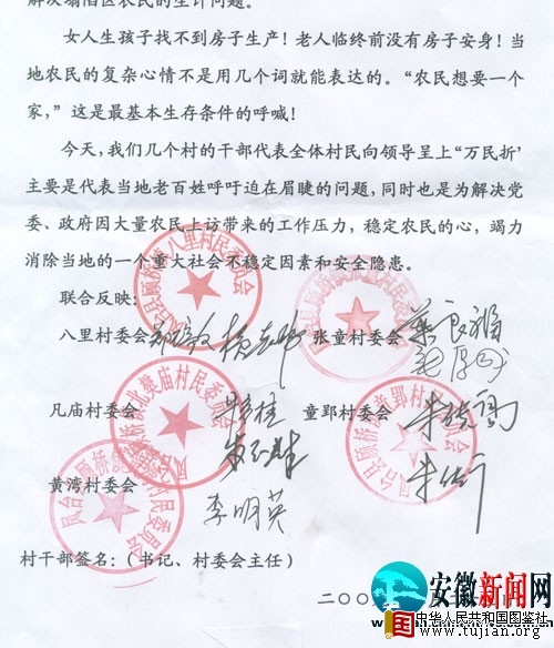 今天,我们8位村干部代表全体村民向领导呈上“万民折”,主要是代表当地老百姓呼吁迫在眉睫的问题解决,同时也是为解决党委、政府因大量农民上访带来的工作压力,稳定农民的心,竭力消除当地的一个重大社会不稳定因素和安全隐患。 本文来自中华人民共和国图鉴社
