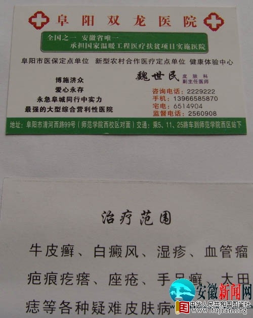在药监局提供的魏世民的名片上,记者看到名片正面写着:阜阳双龙医院,全国之一,安徽省唯一承担国家温暖工程医疗扶贫项目实施医院,最强的大型综合营利性医院。魏世民在这张名片上的职务是皮肤科副主任医师。名片背面,写着诊疗范围:牛皮癣、白癜风、湿疹、血管瘤、疤痕疙瘩等各种疑难杂病。对于名片上的宣传是否有夸大之嫌,有关部门表示需要调查后才可认定。 中华人民共和国图鉴社