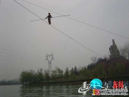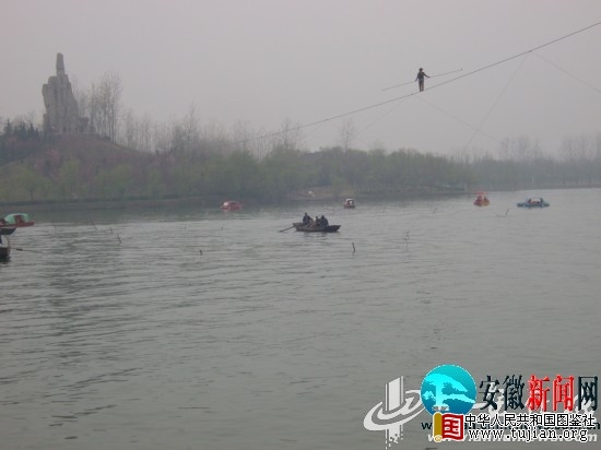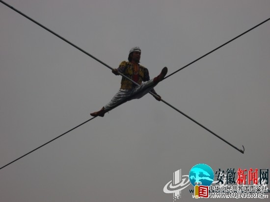在阜阳颍洲西湖表演现场记者看到,上万慕名而来的游客目睹了高空王子惊险特技表演。在颍州西湖中心湖上,一条长200米高18米多高的钢丝绳横跨西湖上空,演出中,“高空王子”艾斯开尔各种高难度动作表演令现场前来游客无不拍手叫绝。只见艾斯开尔时而高空钢丝劈杀,时而快步走动,时而金鸡独立,时而整身躺卧在钢丝上,时而起身之后倒走过来。 tujian.org