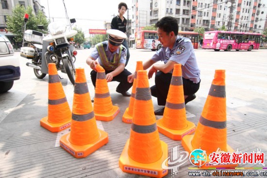 7月21日,民警调试新型反光锥柱。当天,蚌埠市交警三大队向路面民警发放新型反光锥柱,以应对7月22日上午日全食发生时道路车辆安全。据该处民警介绍,该反光锥可直接折叠,反光性强,携带方便,日食发生时天空变暗,可放在道路和斑马线附近,提醒过往车辆注意安全。(陈昂 庞小梅 图/文)
