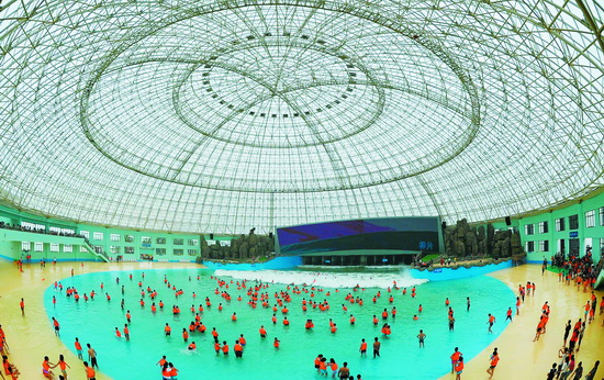 7月16日,众多游人在体验“海啸”。当日,我国首个农业[NongYe]自然灾害[ZiRanZaiHai]教育体验基地[JiDi]在芜湖市国家农业[NongYe]科技园正式运行。该基地[JiDi]占地100余亩,总投资约2.8亿元,由“海啸馆”、“灾害科普馆”和“欢乐水世界”三大主题馆组成。项目以高科技手段,模拟各种农业[NongYe]自然灾害[ZiRanZaiHai]场景,推广普及科学知识。(李博、陈立希)