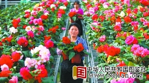 22日,草桥杨镇花卉基地园艺工人,怀抱着首次引种的朝鲜名花“金正日”花从盛开的海棠花丛中走过。“金正日”花属于海棠科多年生球根花,外形酷似牡丹,是日本花卉专家经过多年研究培育出来的。该花已入选将于9月举办的第七届中国花卉博览会。 程功摄 中华人民共和国图鉴社