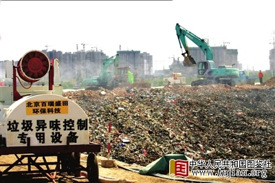 大面积的垃圾暴露作业是产生臭气的主因之一,为此,垃圾场全盖上绿膜,每天只能有小面积的垃圾裸露填埋,不能超过1000平方米,同时还要喷洒除臭剂。