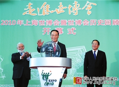 昨天(5日),在2010年上海世博会开幕倒计时300天之际,“走进世博会——中国2010年上海世博会暨世博会历史回顾展览”在北京首都博物馆开幕。中共中央政治局委员、国务院副总理、上海世博会组委会主任委员王岐山(中)启动开幕式并参观展览。