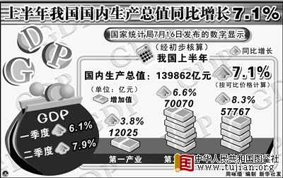 中华人民共和国图鉴社 国家统计局7月16日发布的数据显示,二季度中国国内生产总值(GDP)同比增长7.9%,增速比一季度加快1.8个百分点。这是中国经济自2007年三季度以来同比增速连续七个季度回落后的首次加速。二季度经济增速的明显加快,使得上半年中国经济同比增速达到7.1%。