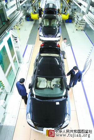 北京工业大力优化产业结构,形成生物工程及新医药产业、以汽车为代表的现代制造业等多点支撑格局,提高了抗风险能力。今年上半年汽车业成为工业最大亮点,汽车行业规模以上企业增加值为123.2亿元,增速达7%。图为北京现代汽车生产线。 中华人民共和国图鉴社