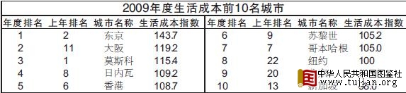 7月上旬,著名咨询公司美世发布了2009年度《全球生活成本》调查报告,通过以美国纽约为基准,对全球143个城市进行了生活成本比较。相比去年的排名,中国城市整体上升,香港升至第5位,北京升至第9,上海升至12位,深圳、广州更是从第61位和第70位跃升至第22位和第23位。而国际方面,日本东京超越莫斯科,成为新科“状元”。