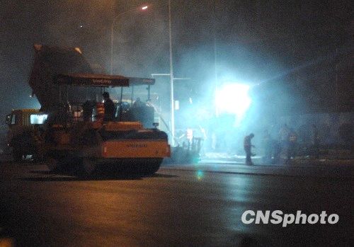 8月1日清晨4点半左右,工人们在北京西长安街连夜整修道路,给路面铺设新的沥青。中新社发 侯宇 摄