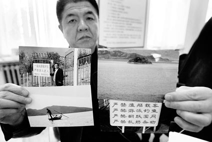 张磊[ZhangLei]说,在起诉前的2010年11月,他为了取证来到小岛,当时这个门是开着的,而且湖里有人打渔,张磊[ZhangLei]拿出了当时的照片让记者看。