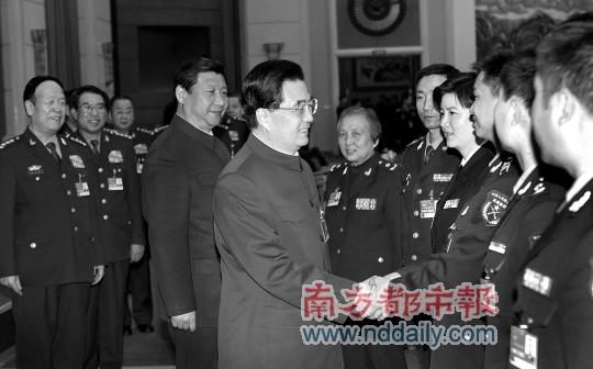 3月12日,解放军代表团全体会议结束时,胡锦涛等军委领导会见来自基层和一线专业技术岗位的部分军队人大代表。 新华社发