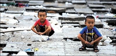 昔日的学校教室已被夷为一片平地,两个孩子在这里玩耍。