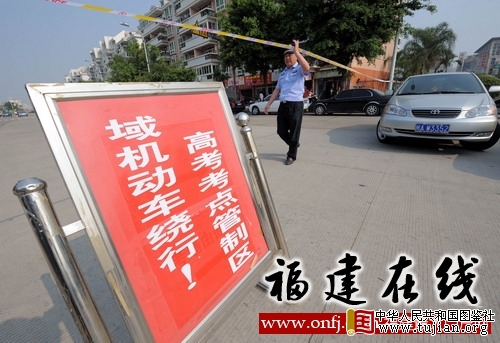 6月7日,民警在福州三中金山分校考点附近设置交通管制区域。