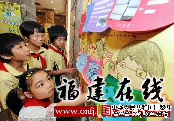 6月6日,福州小朋友在两岸城市青少年创意族谱联展上参观。